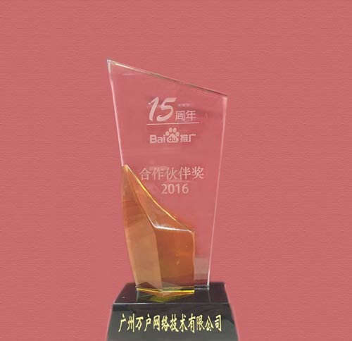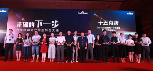 同时,大会还进行2016百度推广十五周年合作伙伴颁奖礼,百度副总裁曾良先生、百度直销分公司总经理陈永胜先生、以及百度广州分公司总经理陈鑫先生给现场获奖企业进行颁奖,万户网络凭借15年来与百度精诚合作共同发展,现场也获颁2016百度推广合作伙伴奖。